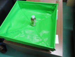ピグのポータブルユーティリティートレーのキャンペーンの紹介です。写真のように小さく丸めてあるトレーが、紐をほどくと真ん中のような形になり、右端のようなトレーになります。